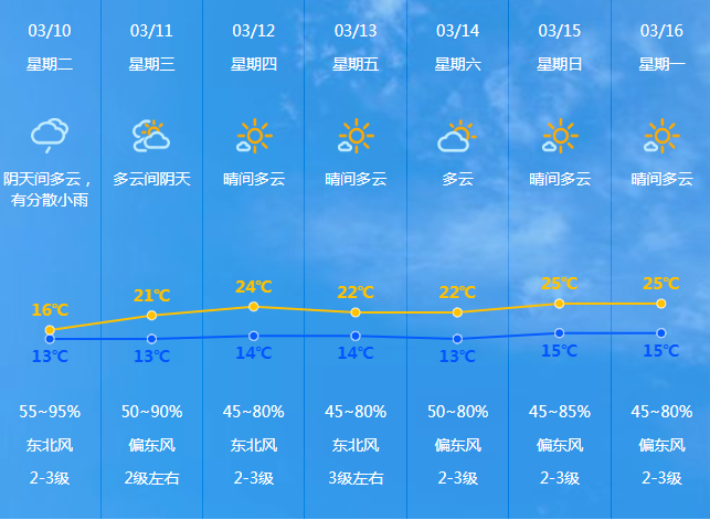 預(yù)計(jì)今天我市維持陰雨天氣,氣溫13-16℃,體感陰涼;11日陰天到多云,13-22℃;12-15日晴到多云,白天陽光充足,14-25℃。