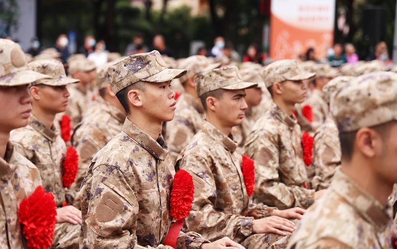 3月15日,中山市2023年新兵入伍歡送大會(huì)在中山市文化藝術(shù)中心廣場(chǎng)舉行。300多名新兵身穿迷彩服,胸戴大紅花,即將奔赴軍營(yíng)。中山軍分區(qū)大校司令員、市征兵工作領(lǐng)導(dǎo)小組副組長(zhǎng)李云濤,市委常委、中山軍分區(qū)大校政治委員、市征兵工作領(lǐng)導(dǎo)小組副組長(zhǎng)劉燦瑩,市征兵工作領(lǐng)導(dǎo)小組副組長(zhǎng)、副市長(zhǎng)、市公安局局長(zhǎng)魯罡,市征兵工作領(lǐng)導(dǎo)小組副組長(zhǎng)、市征兵辦主任、軍分區(qū)大校副司令員李健出席送兵儀式。 300多名新兵身穿迷彩服,胸佩大紅花,即將奔赴軍營(yíng)。記者 文波 攝