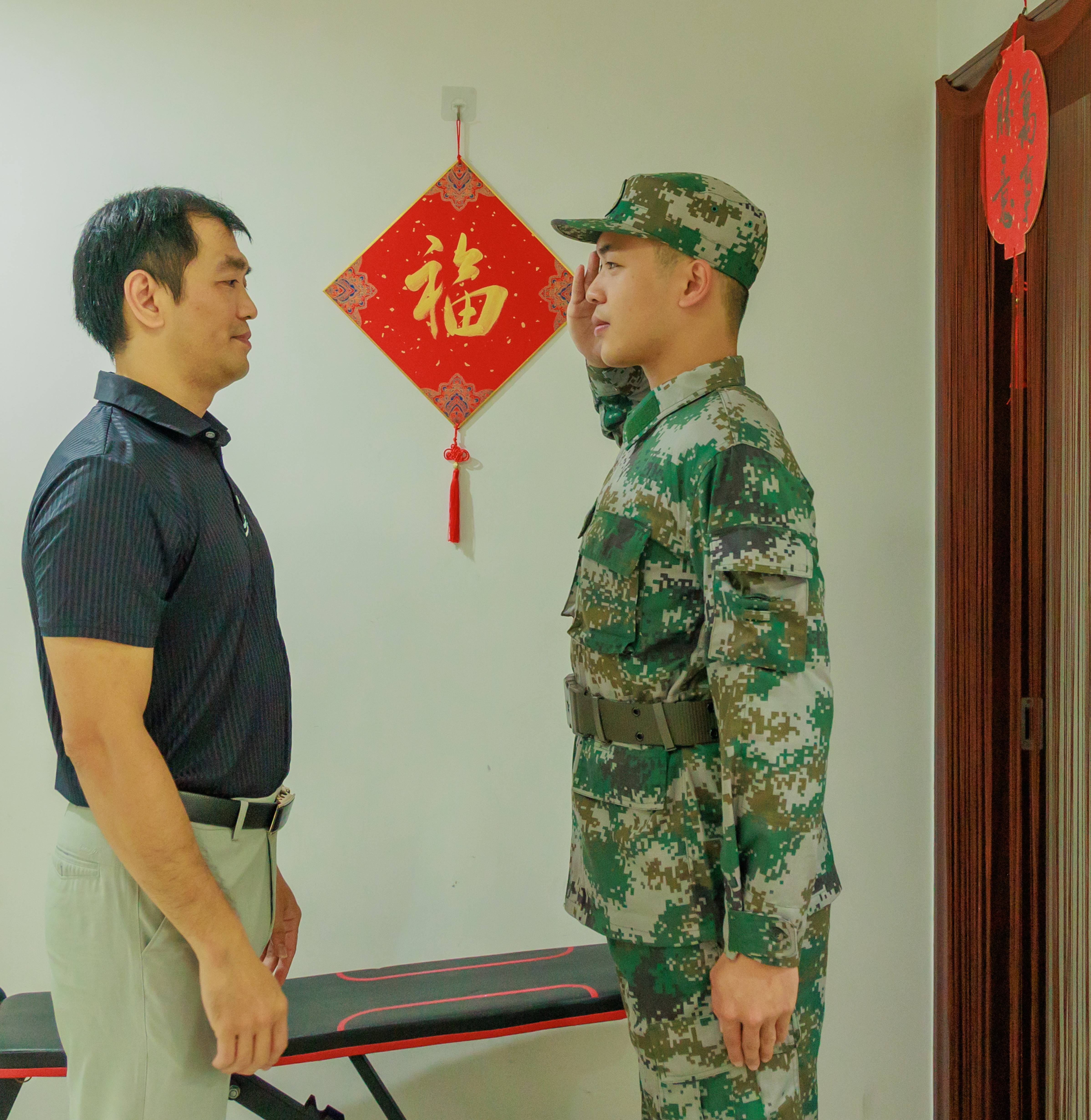 “我將把五彩的夢想交給迷彩去儲藏……”9月8日,中山市東區(qū)街道舉行2023年下半年入伍青年歡送座談會,新兵代表楊尚霖激動地說。楊尚霖現(xiàn)已領取入伍通知書,并前往中山市國防教育基地開展役前訓練,幾天后將啟程前往部隊服役。 楊尚霖給父親敬禮。馬衛(wèi)星 攝
