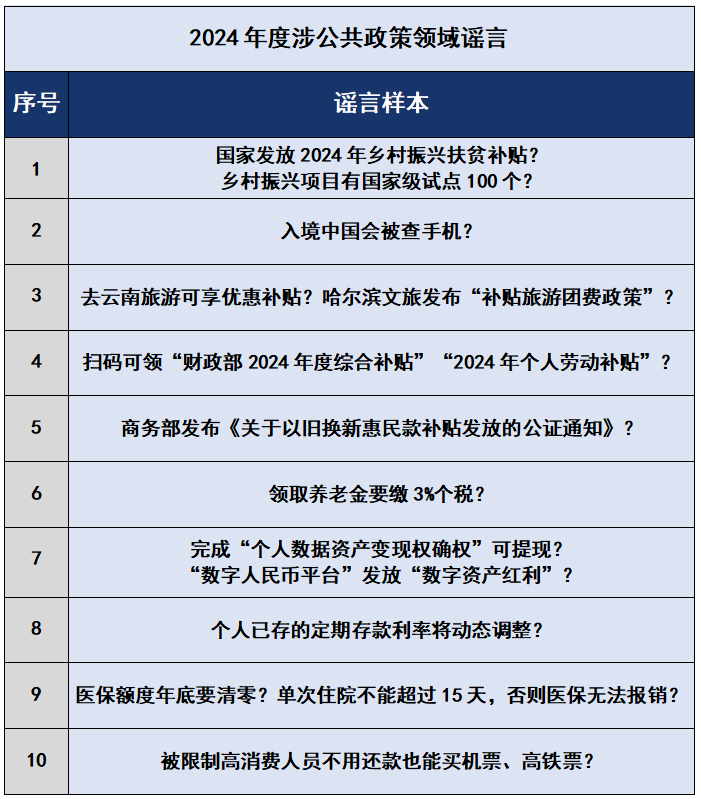 2024年3月,有不法分子冒用國家機關名義,假稱“國家發(fā)放2024年鄉(xiāng)村振興扶貧補貼”“鄉(xiāng)村振興項目有國家級試點100個”,以高額返利為誘餌,引誘大量不明真相的群眾加入所謂的各類“基金會”和“項目”,巧立名目騙取錢財。還有自媒體從公開發(fā)布的政策信息中摘取碎片化信息,斷章取義,對政策歪曲解讀。如2024年10月,個別自媒體故意混淆“個人養(yǎng)老金”與“基本養(yǎng)老金”的概念,傳播“領取養(yǎng)老金要繳3%個稅”“養(yǎng)老金個稅起征點為5000元”等不實信息,引發(fā)公眾誤解。此外,在《國家安全機關行政執(zhí)法程序規(guī)定》和《國家安全機關辦理刑事案件程序規(guī)定》公布之際,一些別有用心之人借機造謠抹黑、搬弄是非,大肆炮制所謂“入境中國都會被查手機”的謠言,荒謬至極。