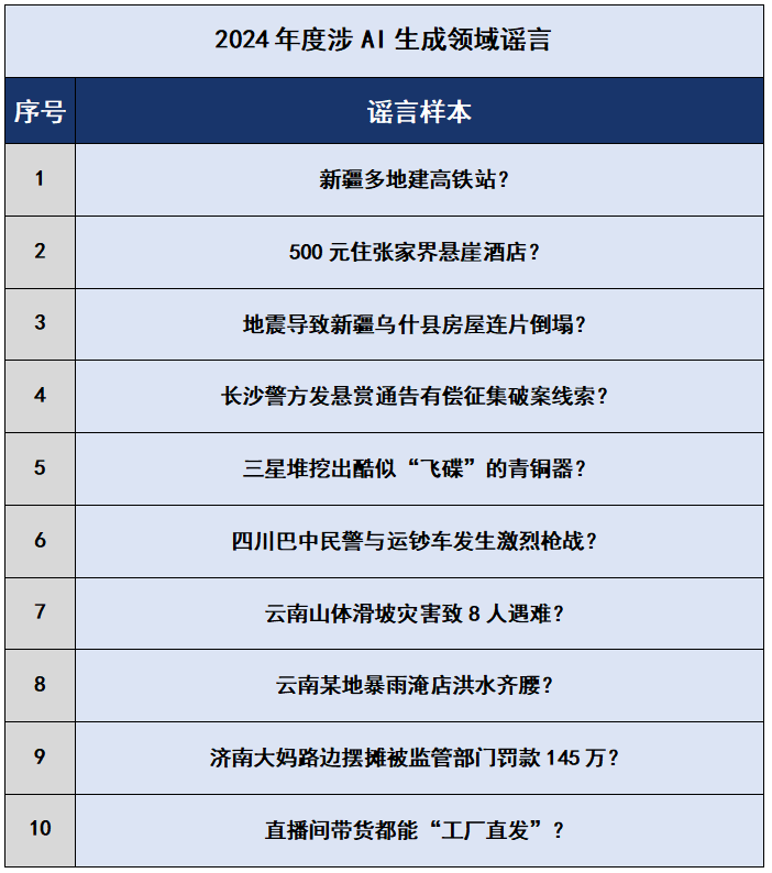 2024年初,“新疆多地建高鐵站”虛假短視頻在網上流傳,此類視頻由軟件智能合成,用戶只需使用指定視頻模板、手動替換涉本人家鄉(xiāng)相關地點的文字即可生成新視頻,利用人們對家鄉(xiāng)基礎設施建設情況的關注而大肆傳播,誤導公眾。還有個別網民為獲取流量和不當利益,利用AI軟件蓄意歪曲“交警請占道停留的運鈔車駛離”的事實,編造謠言“四川巴中民警與運鈔車發(fā)生激烈槍戰(zhàn)”,造成公眾恐慌和誤解。此外,謠言“濟南大媽路邊擺攤被監(jiān)管部門罰款145萬”實為AI工具生成的虛假文章,大肆消費公眾的同情心博取眼球,引發(fā)大范圍傳播,造成不良社會影響,相關違法人員被公安機關依法行政拘留?!霸颇仙襟w滑坡災害致8人遇難”“地震導致新疆烏什縣房屋連片倒塌”“云南某地暴雨淹店洪水齊腰”等謠言則純屬子虛烏有,均為AI特效炮制的虛假視頻,利用公眾對災難事件的重視編造傷亡情況,制造恐慌情緒,擾亂社會秩序。