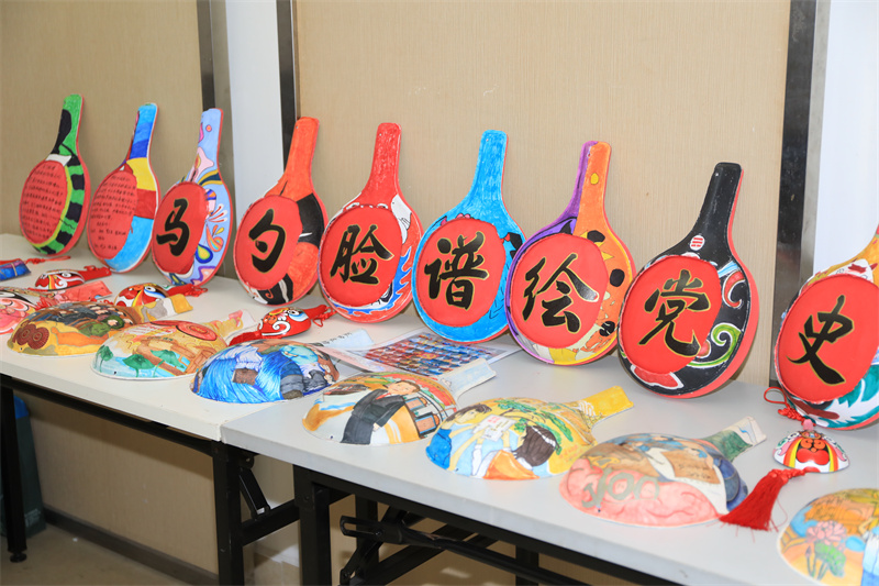 中國共產(chǎn)黨成立100周年標(biāo)識、井岡山勝利會師、南昌起義、嘉興游船上舉行的中共一大、萬里長征路……分享會現(xiàn)場,刻畫了一個個黨史故事的木瓢排列成行,十分引人注目?!斑@是國家級非物質(zhì)文化遺產(chǎn)——馬勺臉譜。它是陜西的傳統(tǒng)民間藝術(shù),以馬勺作‘紙’,將社火臉譜以彩繪的形式繪制在上面?!瘪R勺臉譜傳承者、沙溪中學(xué)老師馬世杰介紹。作為一名美術(shù)老師,馬世杰通過民間藝術(shù)的再創(chuàng)新來引導(dǎo)學(xué)生學(xué)習(xí)黨史,在他的帶領(lǐng)下,沙溪中學(xué)的學(xué)生將南粵特色、中山元素、國風(fēng)動漫等融入馬勺臉譜的創(chuàng)作中。“繪制黨史故事前,我們查閱了大量資料,并向?qū)<覍W(xué)者請教,在創(chuàng)作中引導(dǎo)學(xué)生們了解、學(xué)習(xí)黨史?!?/p>